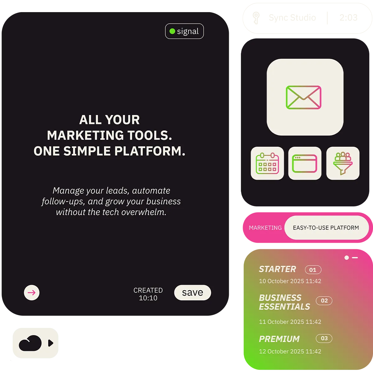 Most business owners lose leads not because they lack clients — but because they lack a simple system. Sync Studio brings your marketing, messaging, calendar, and website together in one easy-to-use platform.